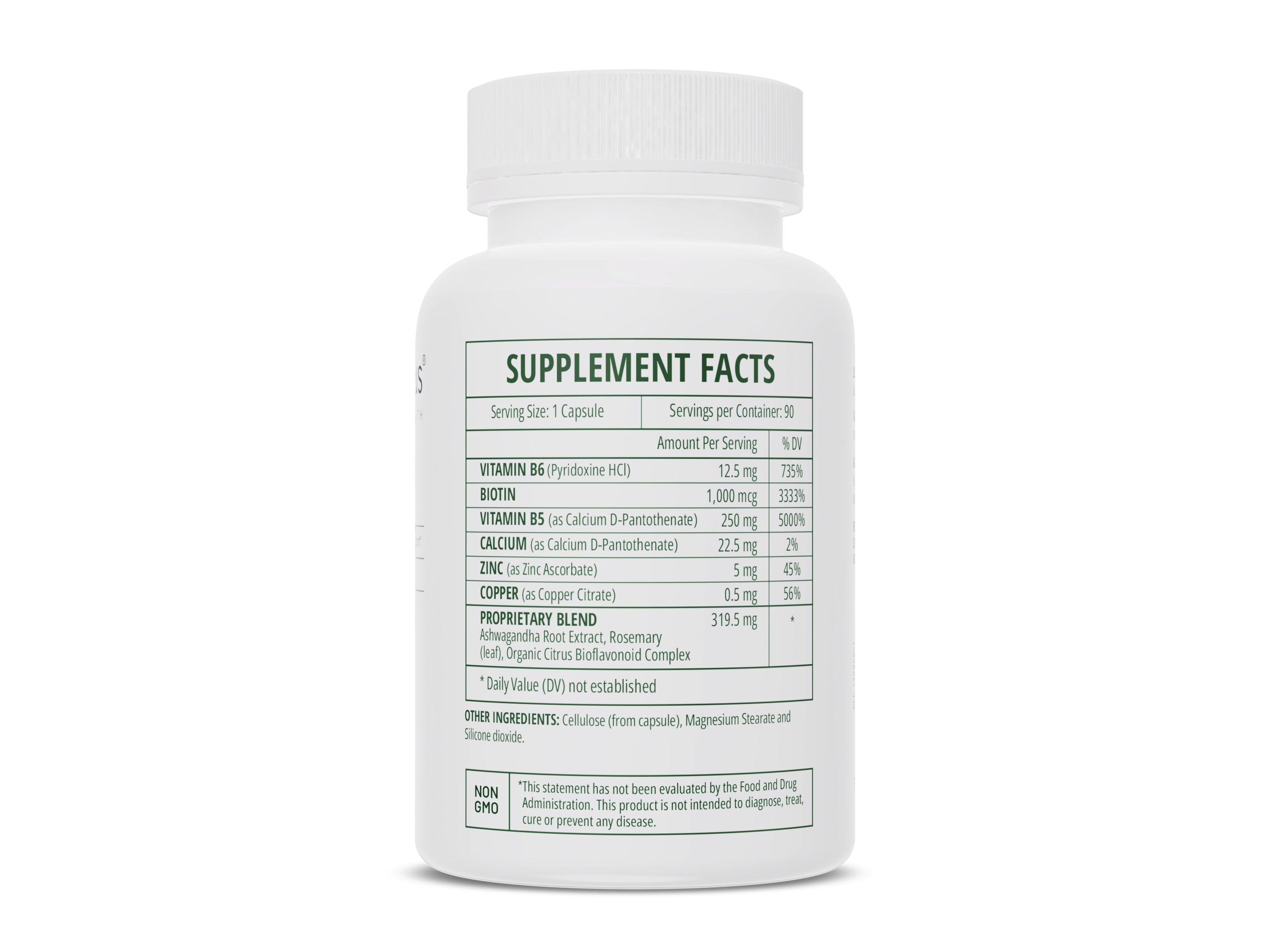 Adapt contains pantothenic acid, vitamin B6, biotin, zinc, copper, ashwagandha, rosemary, and citrus bioflavonoids.