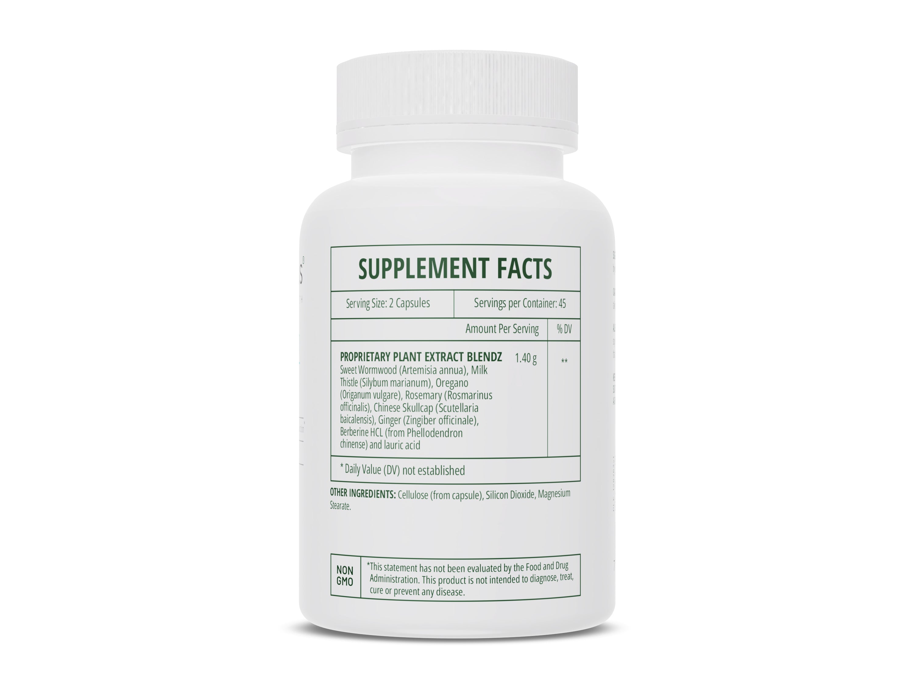 Proprietary Plant Extract Blend: Sweet Wormwood, Milk Thistle, Oregano, Rosemary, Ginger, Chinese Skullcap, Berberine Hydrochloride and lauric acid.
