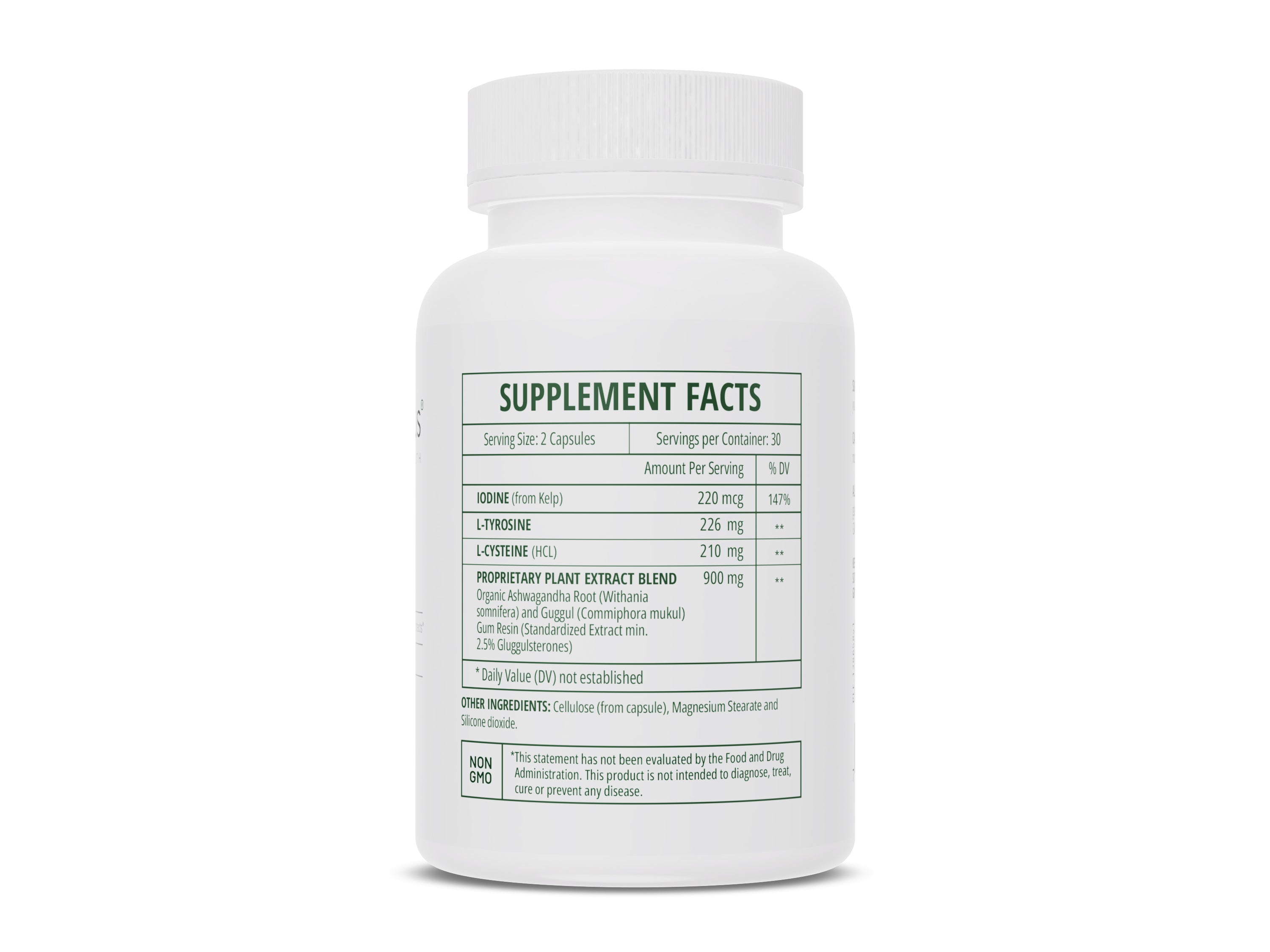 Iodine, L-Tyrosine & L-Cysteine HCl, Proprietary Plant Extract Blend: Ashwagandha root & Guggul gum.