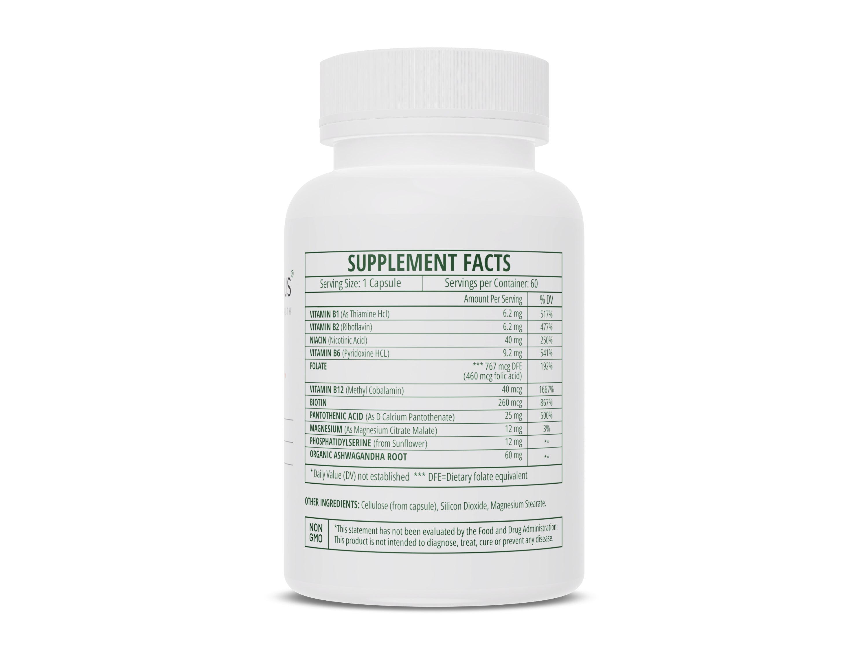 Vitamin B1, Vitamin B2, Niacin, Vitamin B6, Folate, Vitamin B12, Biotin, Pantothenic Acid, Magnesium, Phosphatidylserine, Organic Ashwagandha Root.